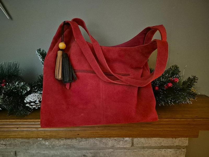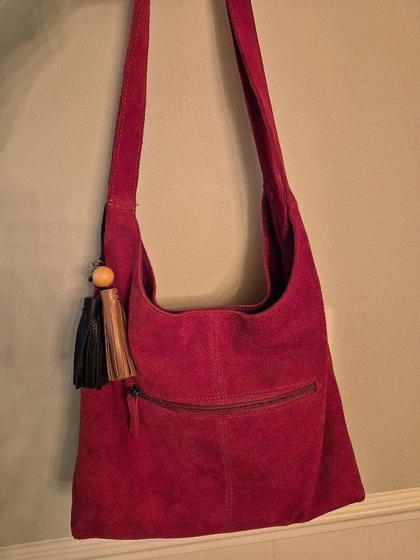 Love this suede bag. Perfect size, perfect weight. The color is beautiful. I have been wanting a red bag forever. This red is the perfect red.