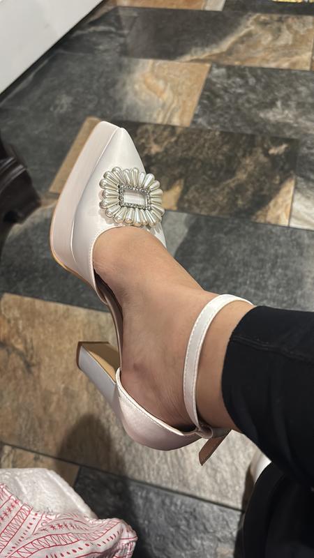 I purchased these shoes for an event and received them with pearls missing and was packaged without the box. Great fit and comfortable and the the thick heel gives added support. If they were in tack I would have given them 10 stars!