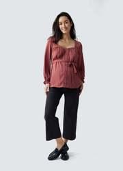 The quintessential dress top. A feminine sweetheart neckline with buttons all the way down (shout out to the nursing moms!). Lightweight and billowy fabric with a silky finish. Elastic ruffled wrists and an optional tie to give your waist some definition or to highlight a bump.