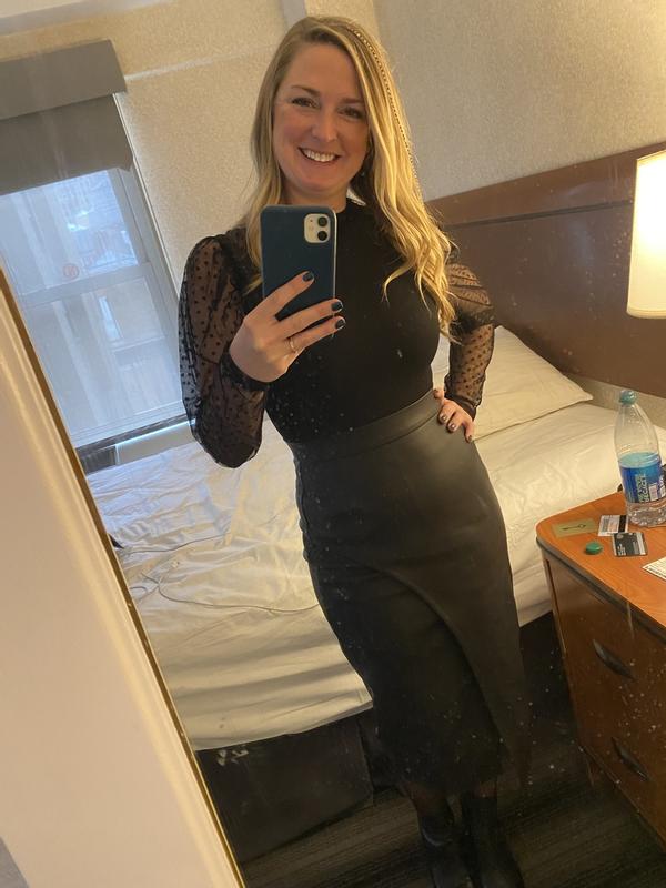 A little snug relative to other skirts the same size from MNYC but not so tight you can't wear it. Definitely looks pleather.