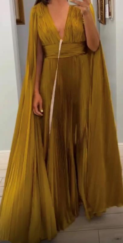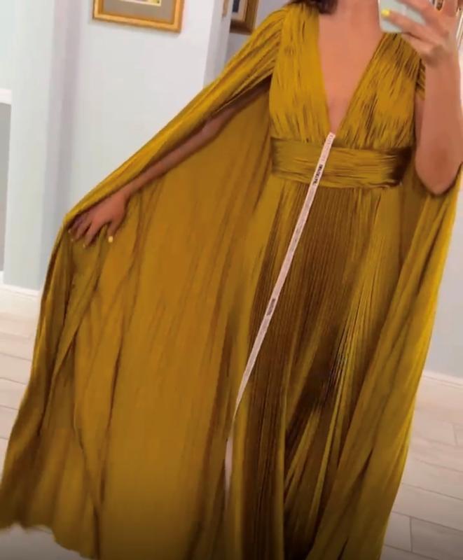 The dress felt heavy on me. I felt like the dress was wearing me instead of the other way around. That said, it is very well made and has a regal Roman goddess energy. If you have perky breasts, this dress is definitely for you, as the cut is very low. And if you’re self-conscious about your arms or back rolls, no worries here... This dress has you completely covered! The cape flows beautifully and hides absolutely everything, with nothing clinging or marking. For reference, I’m 5’7”, 135 lbs, bra band 36, and I ordered a size 6. It was a bit tight when closing the zipper. The color sits right between olive green and antique gold.