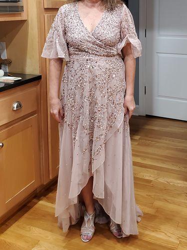 The dress is beautiful. It did not fit me it was actually too large so I had to return it. The only reason I gave it 4 stars instead of 5 stars was the color was noted as lilac and is was very muted. The quality was fabulous and I would certainly try a Mac Dugal dress for any occasion.