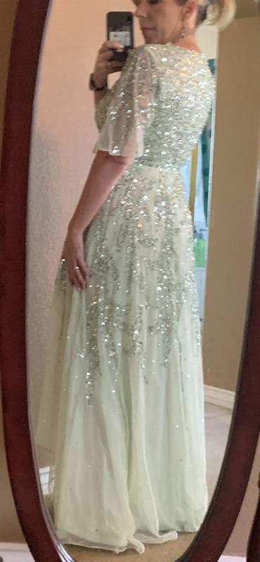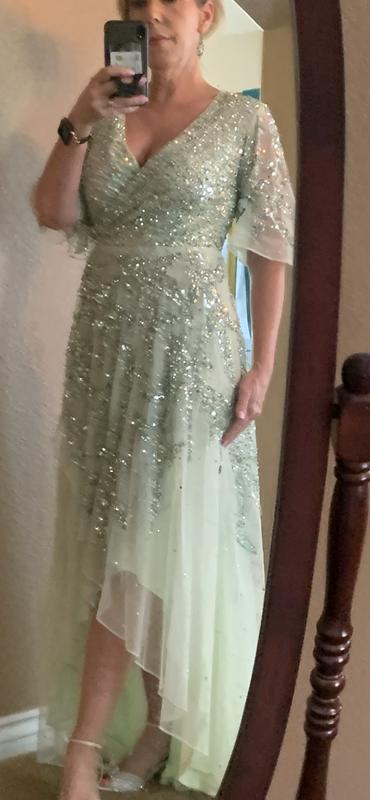 This dress is beautiful! Listed as sage green but it is more of a soft green. I love the neckline and the high low hem. I am 5’2 and the neckline and hem work together to make me look taller - many full length dresses are not flattering for short women. It’s the perfect mother of groom dress !