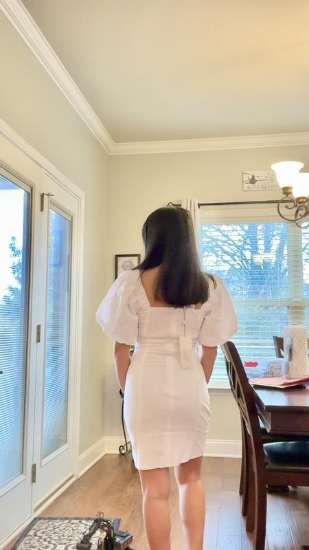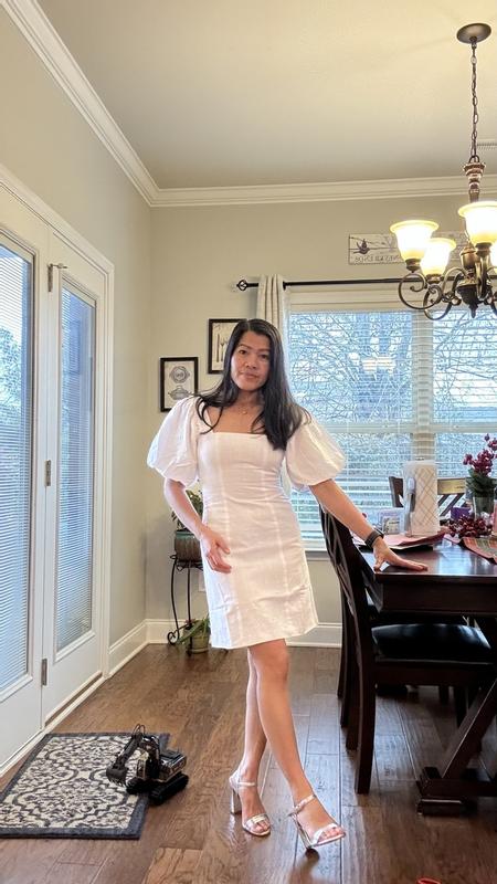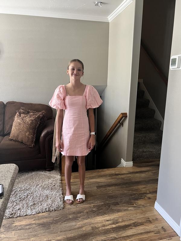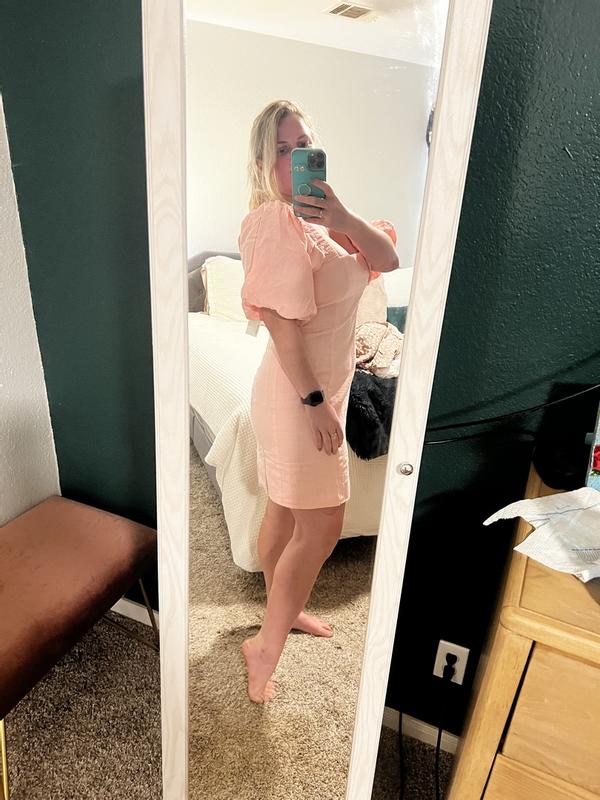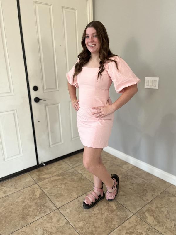 I got so many compliments on this dress (in pink) at my cousin’s graduation ceremony! I am 5’1 and 119 pounds and got a size small. The sleeves did slip a few times and it was more form fitting on me than in the picture. I will definitely keep this dress in rotation though because so many people kept talking about how cute it was! I would size up only if you don’t want the fitted look. Also beware that once you sit down, the fabric will wrinkle!
