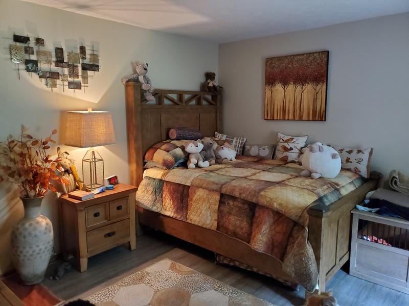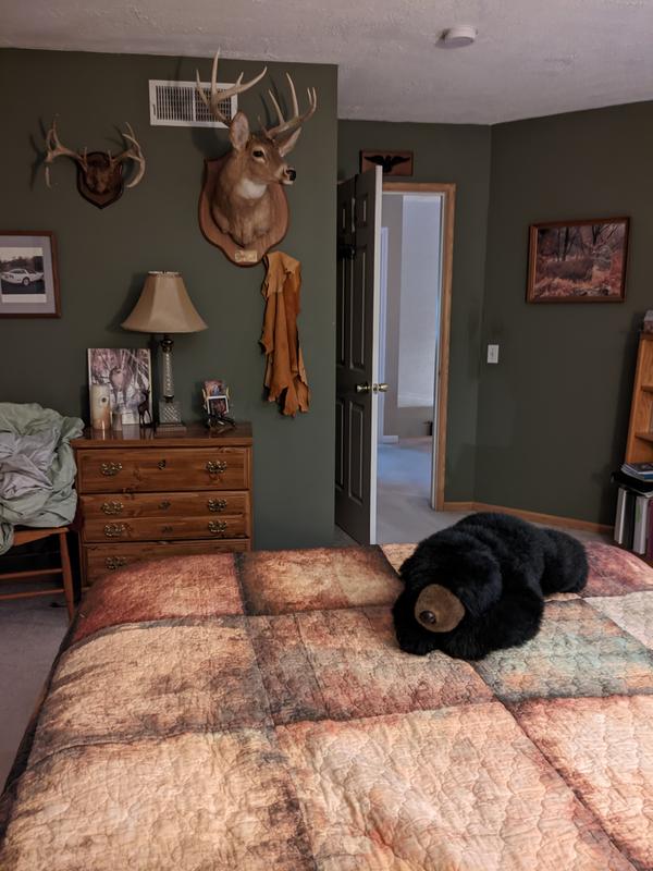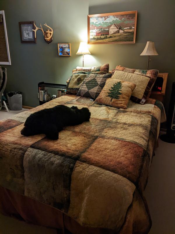 I am so happy with the way my room lit up with the pattern and interest of the set. The room was a dark green and decorated with my husband's hunting trophies. This bedding just brightened things up and fit perfectly with the decor. I loved finding some pillows to add interest.