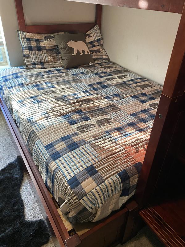This quilt is absolutely stunning reminds me of when I was up north all the colors and the bears on it. Comes with a decorative pillow with a bear on it and 2 shams. The stitching is well done and its easy to wash and dry and care for. Love the tans and bears the most on this and really is comfortable and warm.