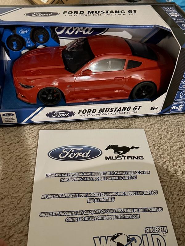 This 1:14 Ford Mustang GT by World Tech Toys looks awesome and drives smoothly on flat surfaces. Setup is super easy, just add AA batteries and go. Build quality feels solid. It handles a few bumps and minor crashes without any issues. The controls are responsive, and the rubber tires grip well. It’s not super fast and battery life is short, but for kids or casual play, it’s perfect. A fun, durable RC car that looks as cool as the real thing!