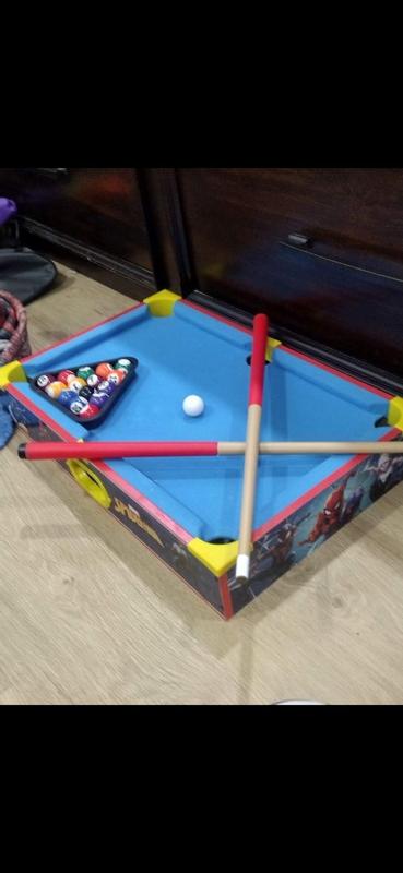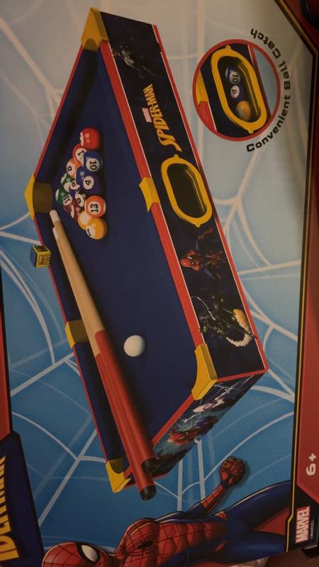 The World Tech Toys Spider-Man Wood Tabletop Pool Table is a nice addition to game night. My daughter has really enjoyed this and also loves Spider-Man. I appreciate that this came completely installed and ready to go. It has mini sized pool balls, a ball rack, two pool sticks and chalk. I like that all the parts can be simply stored under the wood table when not in use. An instruction page is included which teaches players 8 ball and 9 ball. This table is very light weight and perfect fun for my 6 year old!