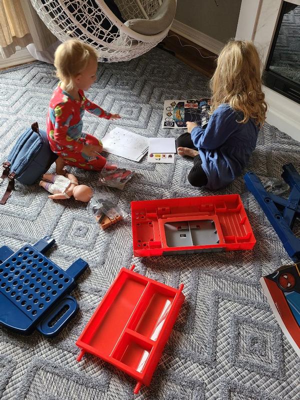 This toy has been a success of joy for my kids. Now, to assemble it, it took some time, about 40 minutes, but it was easy and the instructions were clear. The design I think it's ok but the material I would've liked it if it was a bit better and less flexible. And the stickers more kid friendly, to be able to take them off without them ripping easily. For the car, I had to cut some plastic off because we weren't able to assemble them at once because the plastic wasn't done right on the wheel sides. Other than that, it's a cool toy.