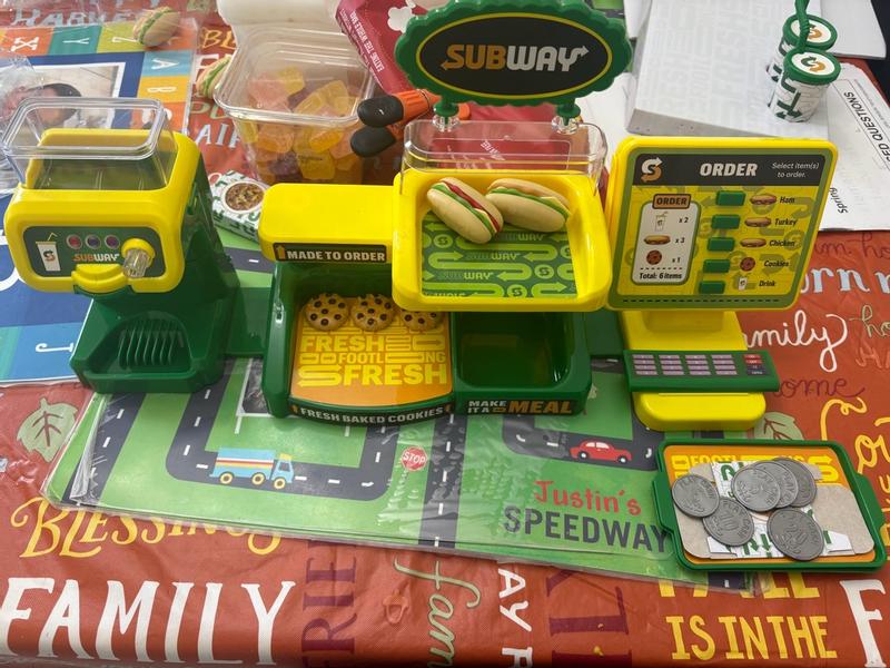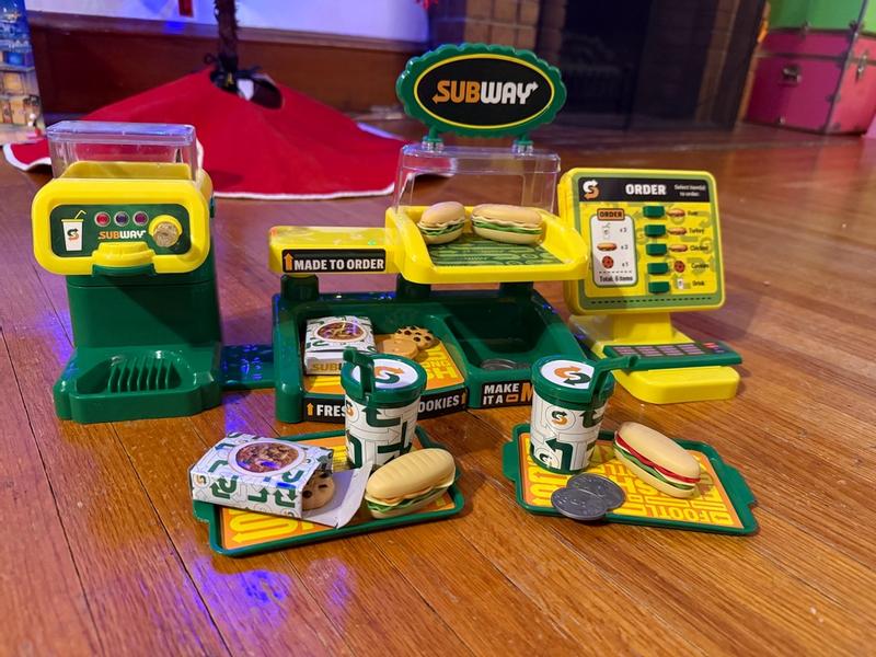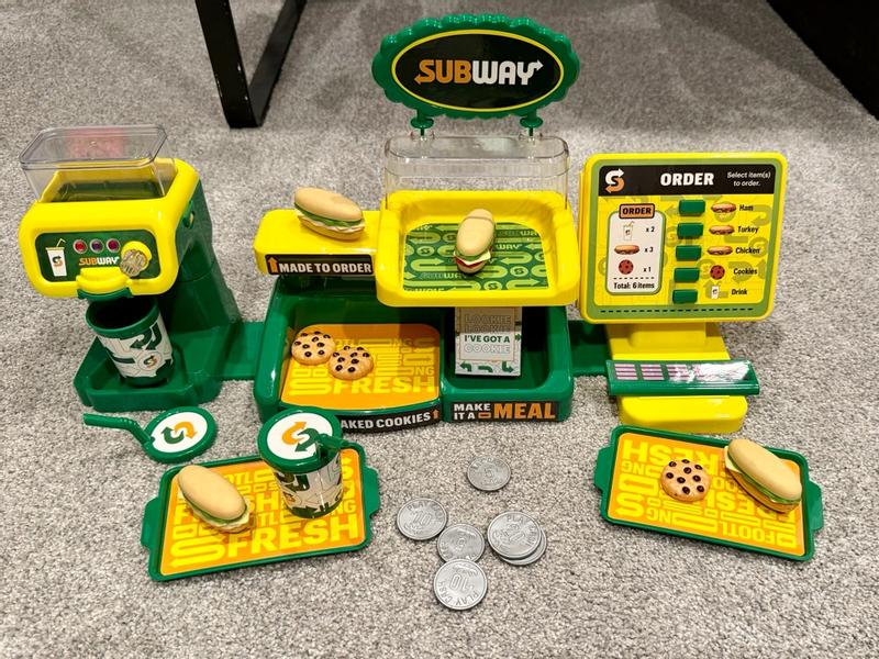 This set is pretty cute because it is Subway-branded with subs, cookies and drinks like you’d order at a shop. But there isn’t actually too much to do with it. The buttons talk to you but it doesn’t add much to the play for it. And the drink dispenser you have to twist a knob to get the liquid to come out and then tighten it to close it. A button to push and release would be better because my kids wouldn’t notice how full the cup was until it was too full but the time it takes to tighten the knob means the water overflowed. And if you keep water in it it can leak out too. The cups are dark green and when you put them under the drink dispenser you can’t see in the cup to notice if it’s getting full. Would be more fun too if the sandwiches were buildable with separate veggies cheese meats and bread to put together. It’s cute but more of a novelty or collector’s item than a toy to be played with.