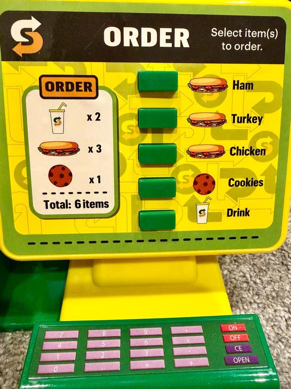 This Subway set is very complete and interactive. It has a variety of options to choose from and makes sounds depending on the product selected. It's a lot of fun. In my case, the turkey sandwich button didn't work; when pressed, it didn't make a sound. Also, I think the paper stickers will deteriorate when using water for the drinks. Otherwise, I think it's a good gift if your children like interactive games. The material it's made of is good quality, the size is great, and the price is very affordable for what it includes. Batteries are not included; you need 2 AAA batteries.