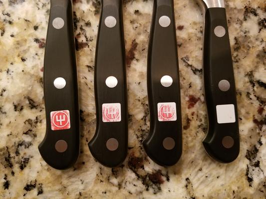 First off, the quality of the actual blades and handles are fantastic. They are well balanced, hold an edge and cut amazingly well. Why the low rating you ask? I was a little disappointed after paying quite a bit for this set and after such a short time (two months) that the logos were printed on the handle and have since washed off. These knives are not heavily used and I followed the washing and care directions to the "T" (hand wash and immediately dry...). The logos on the handles of the knives have worn away and some are just a white square. Again, they are fantastic knives and I enjoy using them immensely, I was just a little disappointed at the quality for the price I paid...