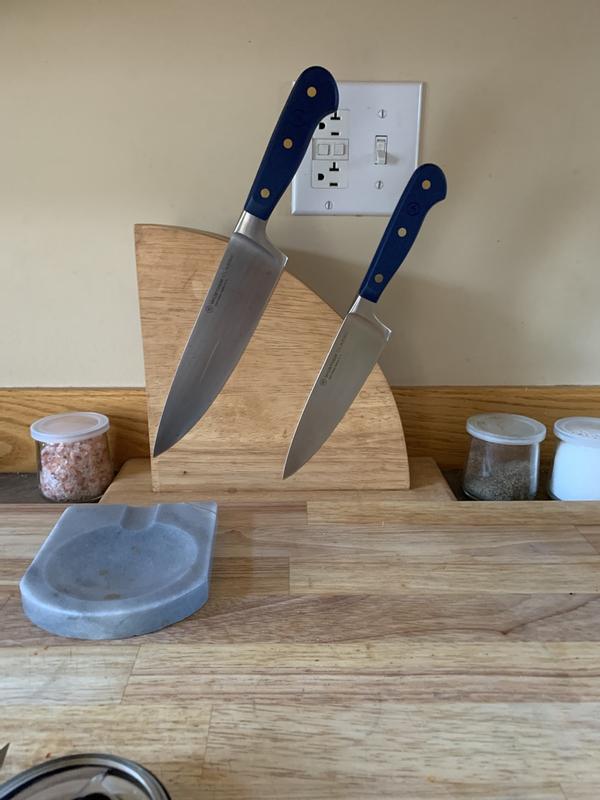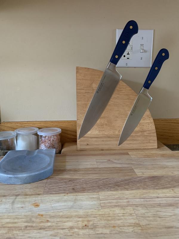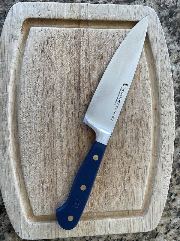 My current knife is a 34yrs old Wusthof classic but difficult to keep sharp. I thought I am due for a backup. I love the navy blue handle as well.