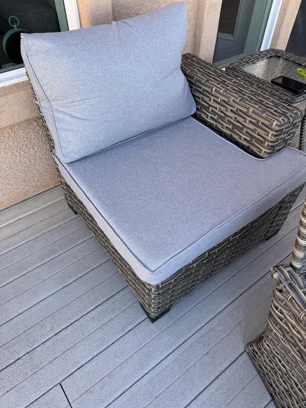 It’s comfy and looks great. Per the instructions, the cushions take 2-3 days to regain its full form. They’re fine after that. My husband and young son put the pieces together, which took a few hours over a few days. My husband would prefer if they labeled the pieces themselves and/or make the instructional images more vivid and clear. I will probably take out the solar lamp insert of the table and put my umbrella through it instead. Overall, I’m pleased with the purchase and would recommend.