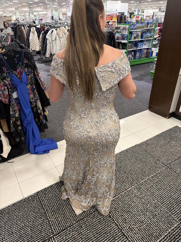 A very pretty gown with lovely lace detailing. It could snag easily if not careful. Slim fit, shapewear needed, but comfortable overall.