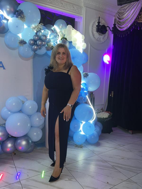 Beautiful navy blue dress in petite. I’m 5’3” 125lbs and size 4P was perfect. Wore this to my son’s wedding. It looks very classy. The slit makes it.