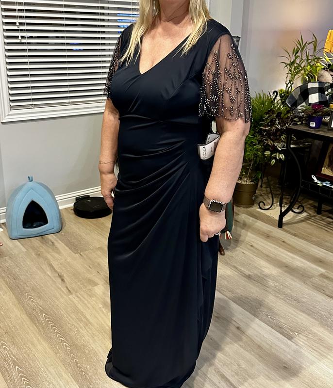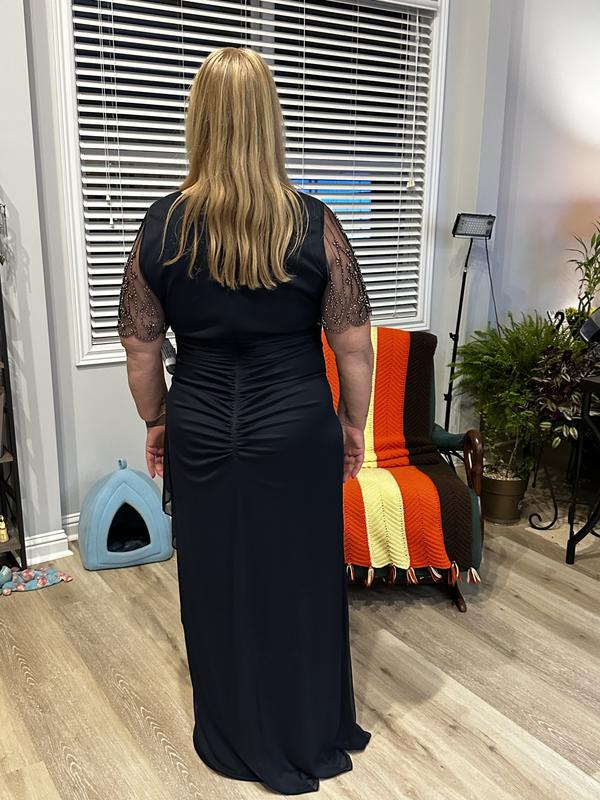 This dress is gorgeous with perfect rouching in the front and the back!! So elegant, the beading on the shoulders is spectacular! I’m 5’6” and it’s a little long for me with low heels.