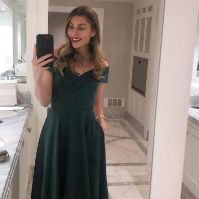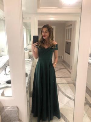 Stunning emerald green color. The waist and hips fit me well but the top was too large - it gaped. If you’re larger-breasted with a slimmer waist, this is worth a try. It’s a classy look with shoulders that stay up. It swishes well. If you’re shorter it will need hemmed.