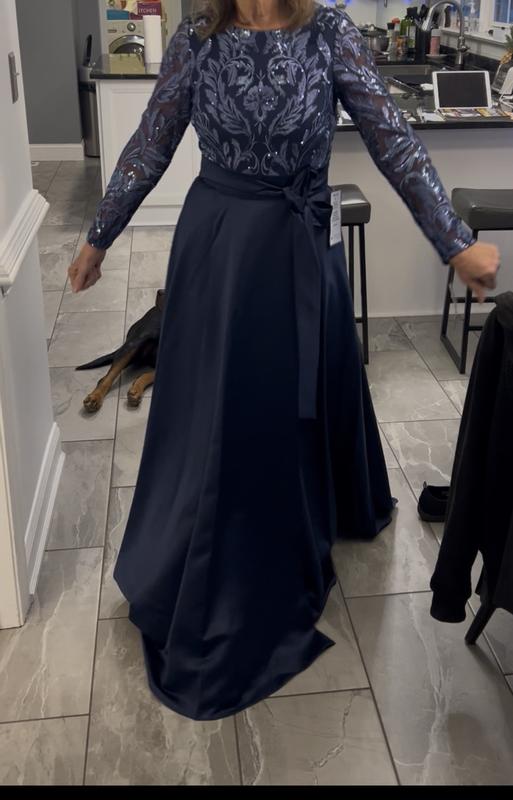 XSCAPEWomen's Boat Neck Sequin Mesh Long Ball Gown