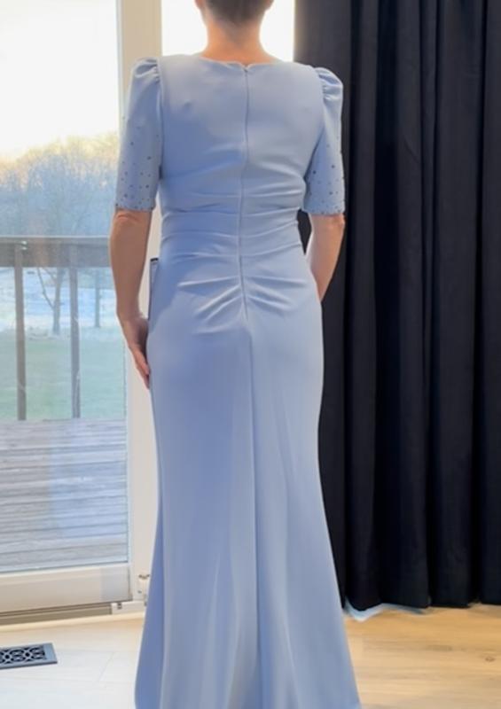 I bought this dress for my daughter’s spring outdoor/ garden wedding. The color is perfect for the day event and the material thick enough to keep me warm. The dress is exactly the color as shown on the picture and fits just great without any alterations. I am 5’7.5’’, 145lbs and bought size 6. It feels very comfortable as it stretches and I have gotten so many compliments from my friends who helped me picking the right gown for the special day. I don’t like to wear very shiny or over the top extravagant clothes and this dress has enough of sparkle on the sleeves yet feels simple and very elegant. I can’t wait to wear it for the event!