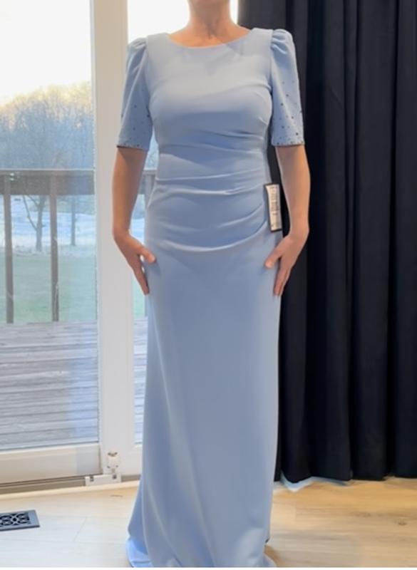 The dress is beautiful , the fit is not true to size with the measuring options . It is extremely long …I am 5’5”. I ordered the size indicated from the size chart and this dress was too small . The bling on the arm is very subtle but effective . The color is a beautiful blue . The texture is unique … think neoprene . My issue was the packing . This dress was rolled up in a box with torn packing paper . No plastic bag covering . It had a large black grease stain on the bottom . Retuning it today . It’s a shame that the packing people don’t appreciate the costs of these expensive dresses and ship them without care or concern.