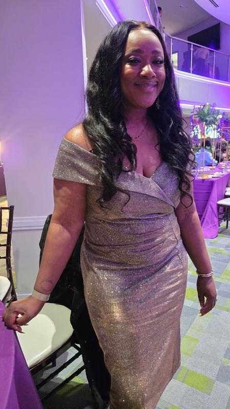 Dress is perfect for the many charity events I attend. Style show neck line & shoulder with elegance. Makes me feel younger and with a very attractive sense. Modern and colorful with the glitter, very sexy.