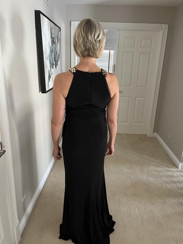 Dazzle with this long dress from XSCAPE, featuring intricate jeweled straps and a halter neckline. The elegant design creates a sophisticated, eye-catching appearance.