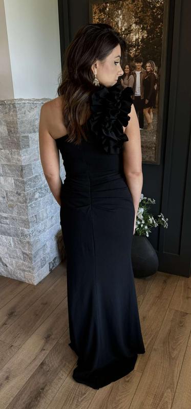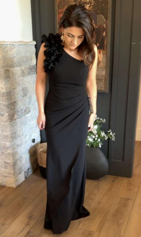 This dress is beautiful and incredibly flattering! I loved the ruffles and the ruching on the back. I can't wait to have another occasion to wear this dress. The top has a built in bra and sticky grip to keep up the sleeveless side.