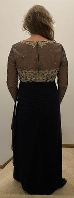 The dress is beautiful and elegant. The delicate beading on the fitted bodice is stunning. The ruching accentuates the fit. If the sleeves weren’t so narrowly cut, it would be perfect. I love the idea of a sleeve but these are quite narrow. The dress is so lovely that I’m willing to put up with the sleeves.