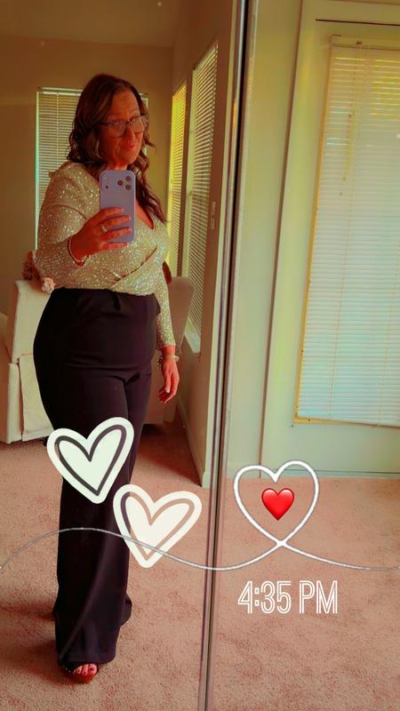 This evening Jumpsuit is gorgeous! The top with the sequins, perfect! That alone makes this entire outfit elegant for any Black-tie evening or formal event. It is not fitted but gives enough to fall nicely on any body type and because of the cut, makes you look tall and slender. Just overall an effortless yet elegant staple to any closet. This could easily be your LBD.