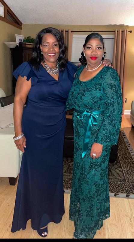 Very pretty gown in navy. Style is flattering and can be worn to a formal party.
