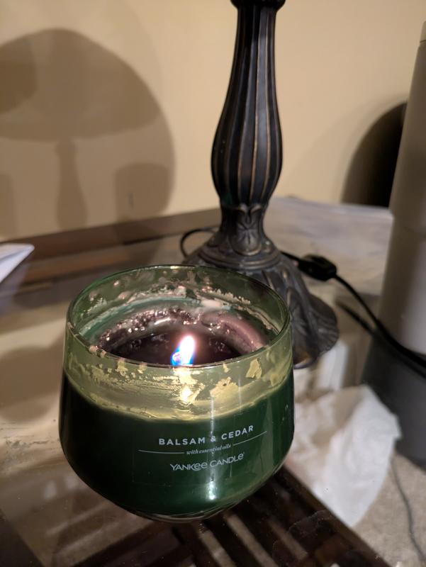 I bought this small container a month ago on 50% off, fragrance is so refreshing and calming.The combination of balsam&cedar smells so good, such a great composition that I'm loving it. And unlike other candles it does not burn out quickly, fragrance is strong and fills the room with the wonderful scent in very little time.Also the wick doesn't fall off in the wax.