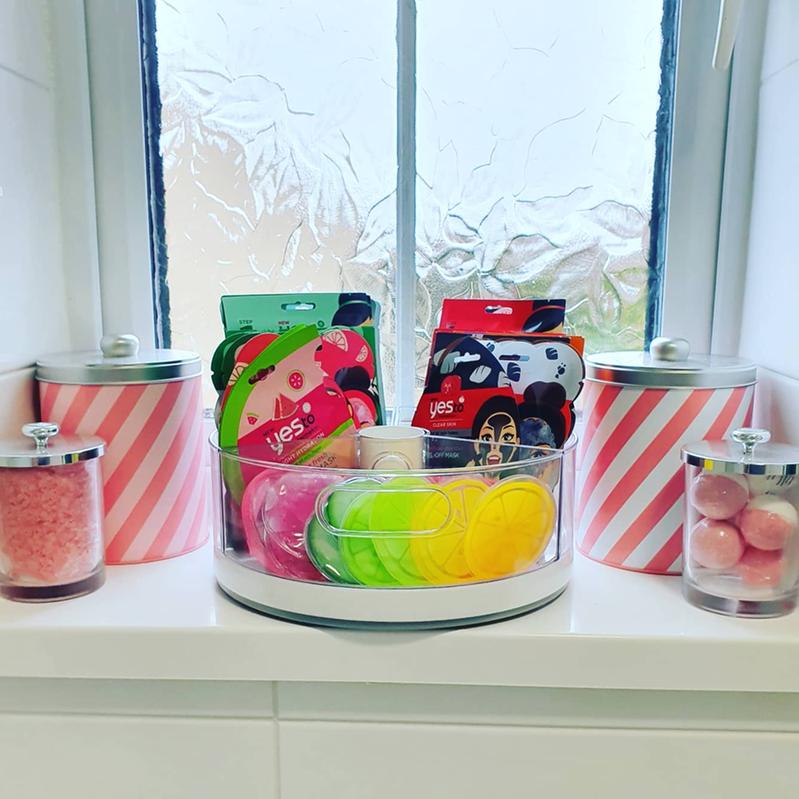 These crazy susans are incredibly useful. I bought one for my husband and another one for me when I reorganized our bathroom. His corrals hair products and supplement packets. Mine corrals daily creams, supplements, and contacts. They are both stored in the cabinets and easy to retrieve items with a spin to the correct bin. I just purchased a third to organize products in my daughter’s dorm room.