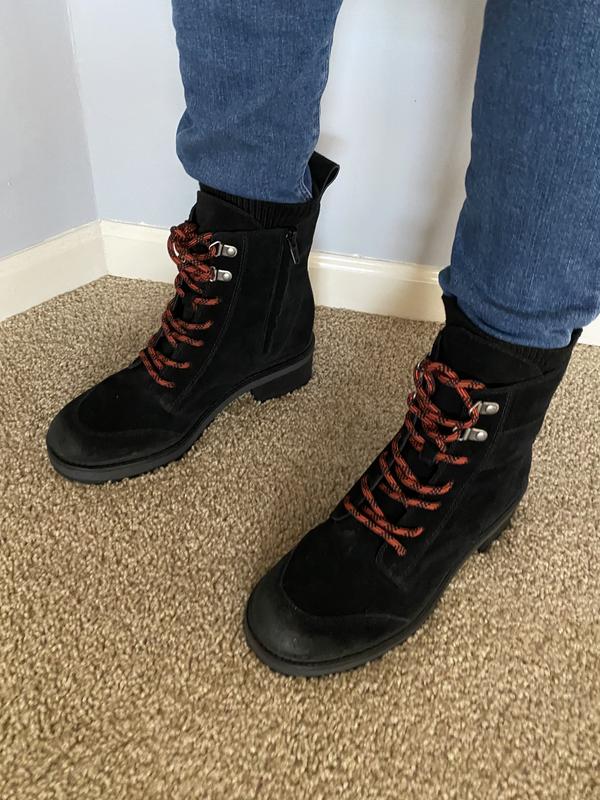 These boots are so adorable. I think the shoelaces bring the whole shoe together. I expected them to be too heavy but they are comfortable and stylish. They don’t look big and bulky. The velvety look is cute and I think they will hold up well. I haven’t worn anything with any type of heal for a couple years after a foot injury and I can walk in these with no problem. Super happy with them. I like that you. Can unzip without having to untie and get into them. I can tuck the laces and they don’t come out. Cute boots!