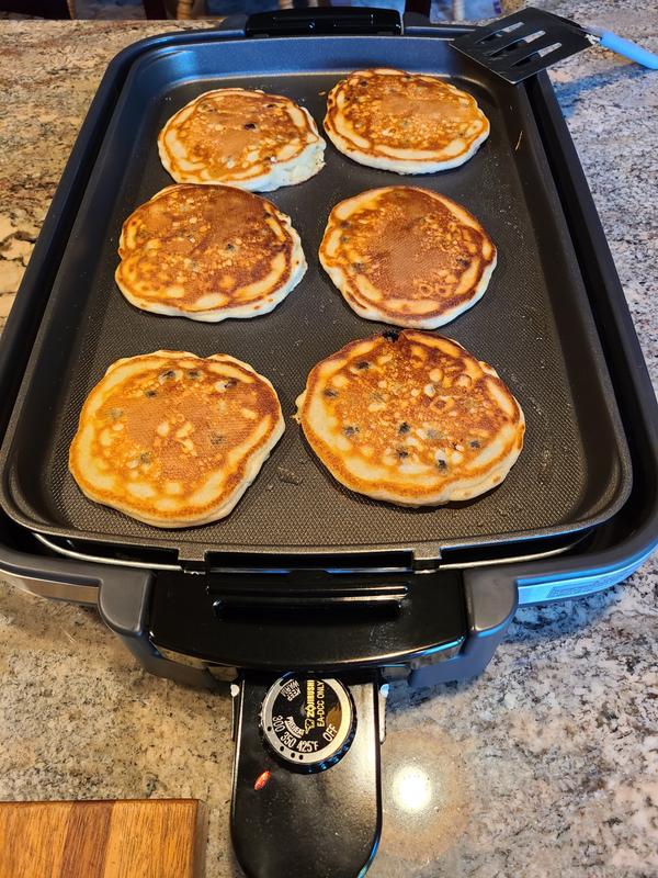 I missed that this griddle is pitted; it is not a smooth surface. the first time I tried pancakes with no oil on the griddle it was surprisingly resistant to releasing the pancakes, for a new griddle. I tried oil the next week and the pancakes more easily lifted off the griddle, but the oil left a film after cleaning. So, cleaning is more difficult than previous griddles owned, non-pitted, e.g., blue berries from pancakes get in the recessed areas. more scrubbing. The pitted design begs questions. It is a non-stick surface, but not as non-stick as I was used to from my aging smooth-surface griddle. Certainly not as easy to clean as I am used to, and I follow the guidance to the letter prior to use and cleaning, let cool. Also, it takes much longer to get to 300, assuming it is 300, than my much older griddle. In fairness, I base my assessment on the light turning off, so there is room for argument that the old griddle might not be so accurate. Not thrilled with this purchase, but it was my mistake missing that it is pitted. I cannot recommend this griddle vs a smooth griddle for items like pancakes. It is, otherwise, solid and feels like a quality item. minus the crazy pits this would be a perfect griddle for my use. NOTE: not thrilled my option to present the review in the email left me at this page to enter everything again.