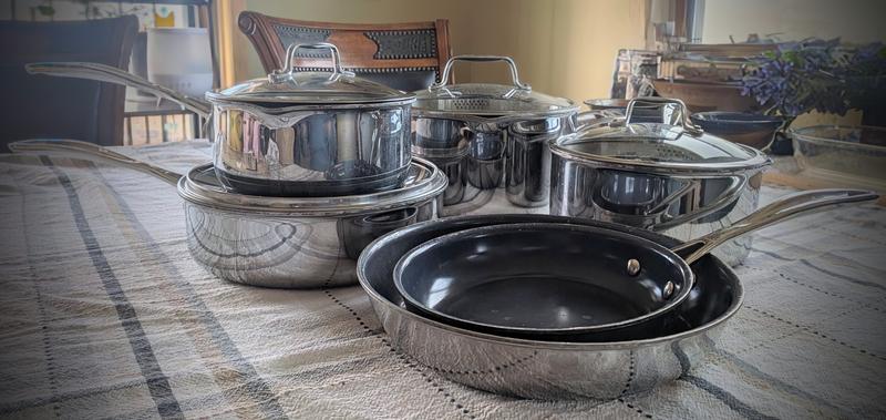 Ceramic coat flakes off on the rims. Everything sticks so should not be considered a non-stick option. Plastic seals in lids starting to come out. Upgraded to a Cuisinart set.