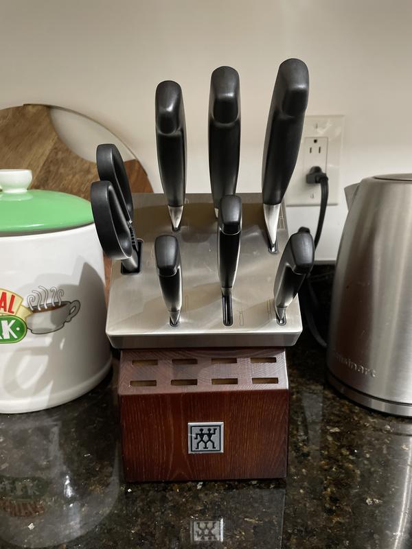 To have a set of 6 very practical knives and kitchen scissors that maintain their edge without having to commit to sharpening it is a true luxury. This set would be a bargain at double the price. Of the highest quality as you would expect from Zwilling. We are more than satisfied.