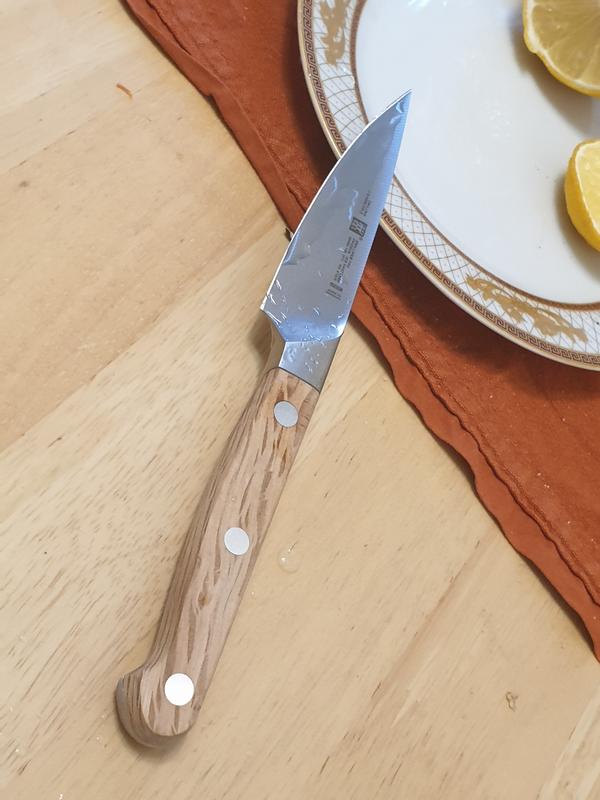 This is my favorite paring knife. The forged German steel blade is very sharp. It stays sharp for a long time and is easy to maintain. The curved bolster makes it very comfortable to hold when working in hand. I love the Oak handle....it really stands out.