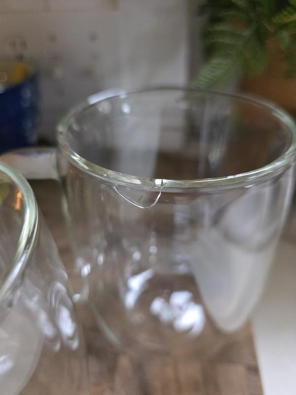 Very disappointed that in less than 2 months, the glass is already cracked in one of the cups. We do not know how this happened as the crack appears to be in between the glass wall. Very disappointed as I was expecting much better quality