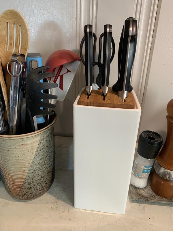 We received this as a wedding gift. The knives are excellent quality and the ceramic block is a cool, sleek option for storage