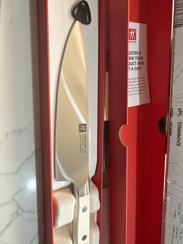 Excellent weight and comfortable handle. Nice blade for slicing n chopping. My only complaint is that the point guard was missing. A blade shield would have been appreciated too! Will still keep knife!!