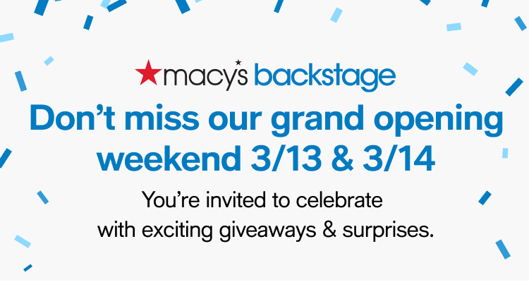 Join us March 13th and 14th to celebrate Macy's Backstage grand opening in store with exciting giveaways & surprises! Like the Macy's Backstage Grand Opening Chance to Win! You can win Backstage store merchandise worth between $5 and $250-prizes will vary by store. Plus, the first 50 customers get a $10 Backstage gift card & additional shoppers get a $5 gift card *. While supplies last. Event subject to change or cancellation. See Macy's Backstage for complete Official Rules and prize details.